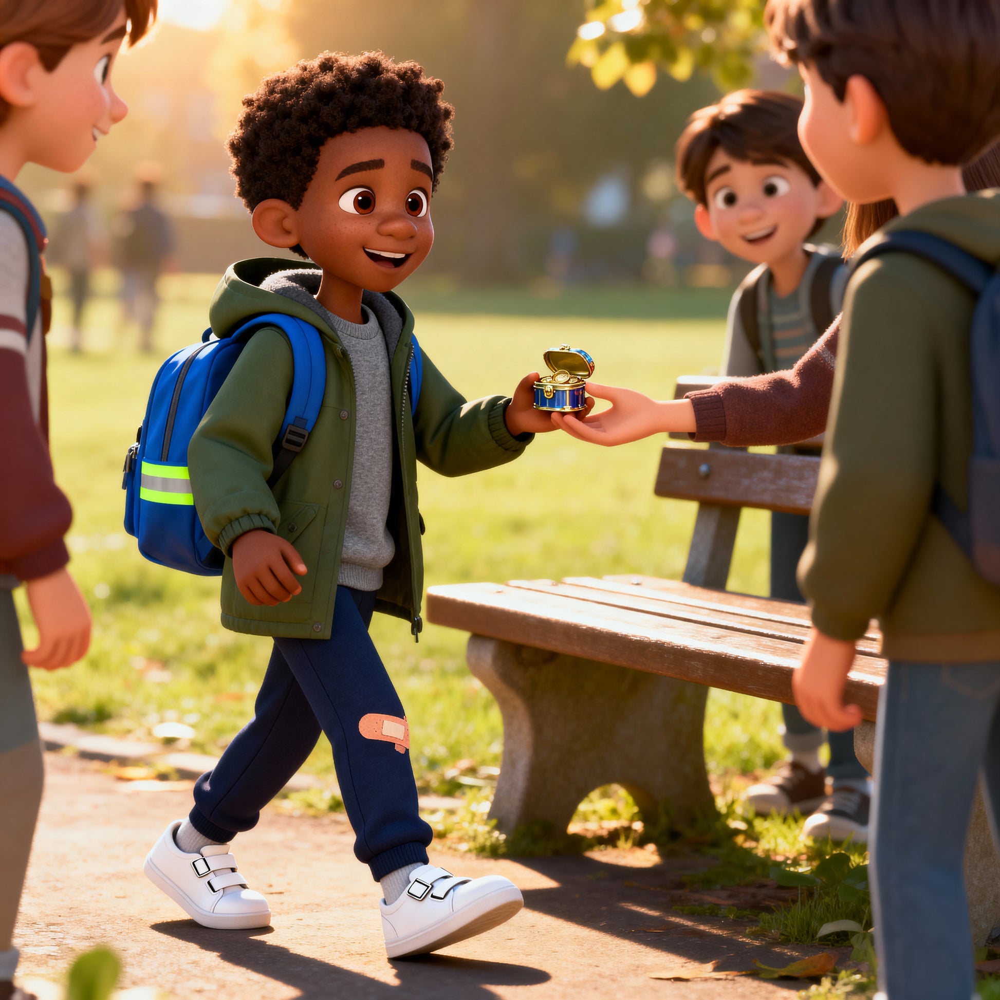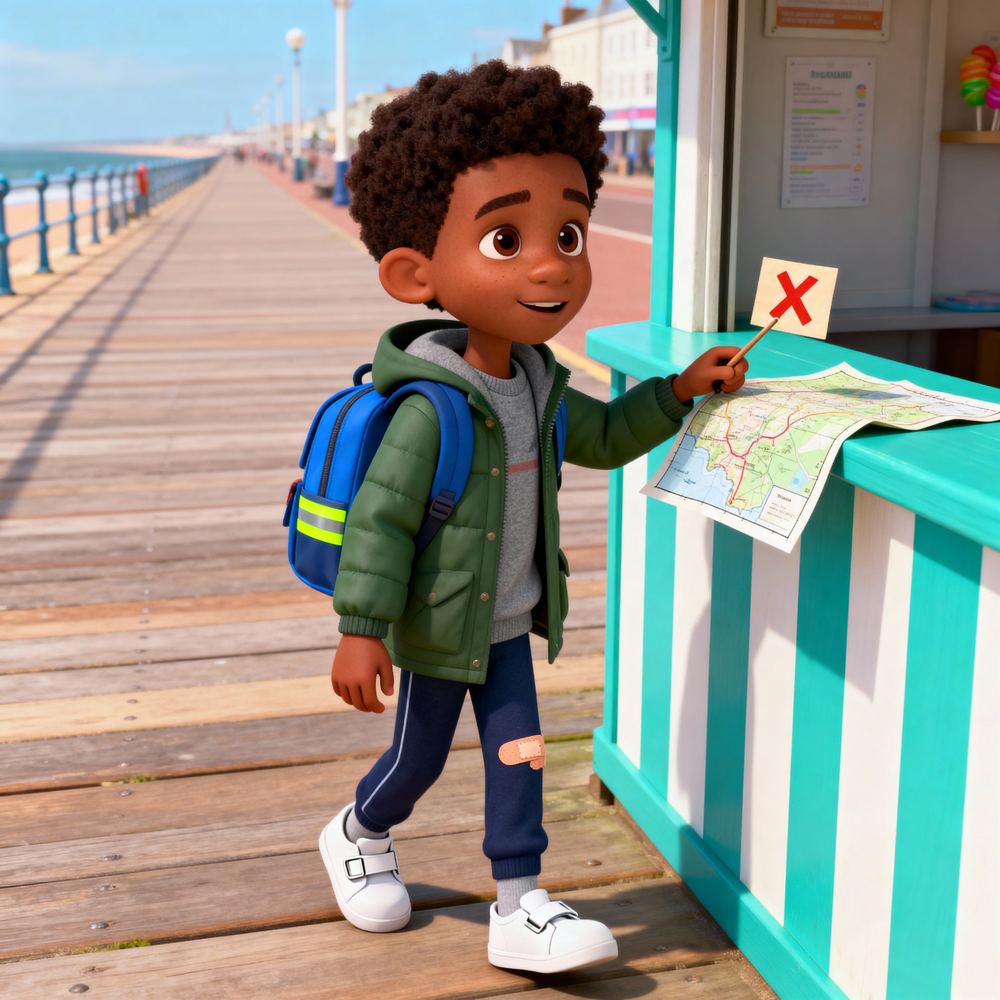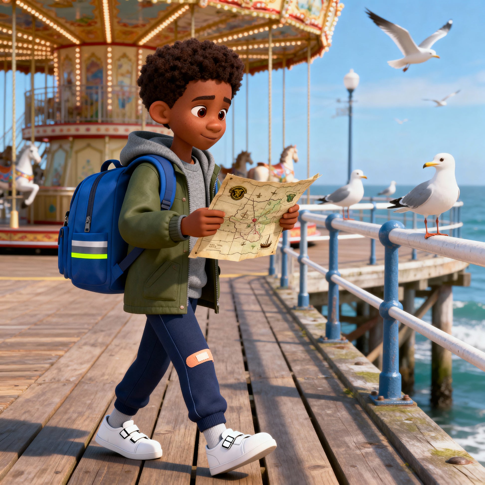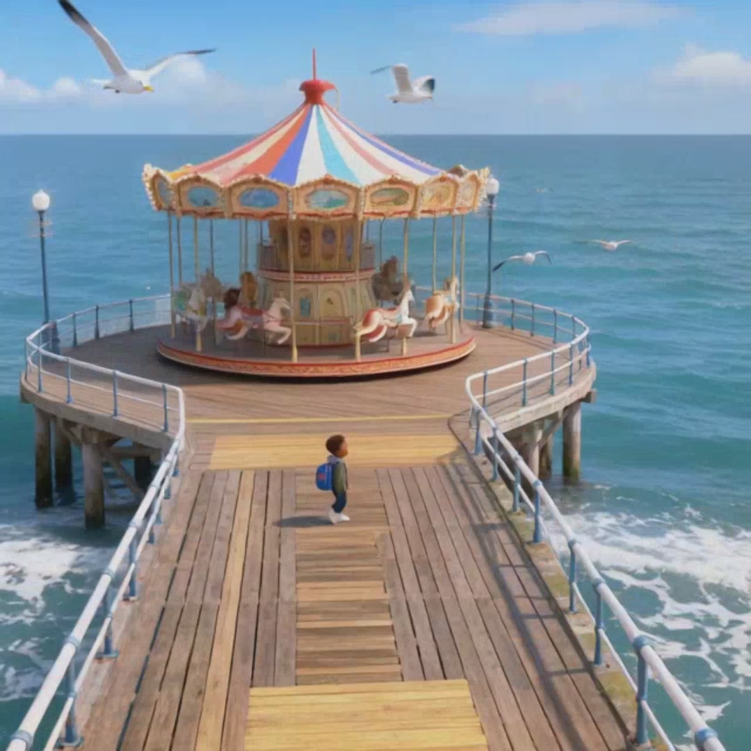 Harmless, jolly pirates share a simple map—your child reads symbols, checks the carousel, and follows the boardwalk to a tiny tin of “treasure” meant to be shared. A parrot or a cat sidekick adds giggles, and the final scene is all about fair play and sharing with friends.